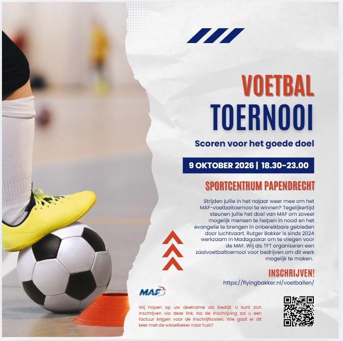 Op DV 9 oktober organiseren we een gezellig bedrijventoernooi. Teams nemen het sportief tegen elkaar op, en de opbrengst van dit toernooi gaat naar de missie van familie Bakker. Een dag vol sportiviteit, plezier en verbondenheid, waarbij we samen iets moois mogen betekenen. Lees meer…